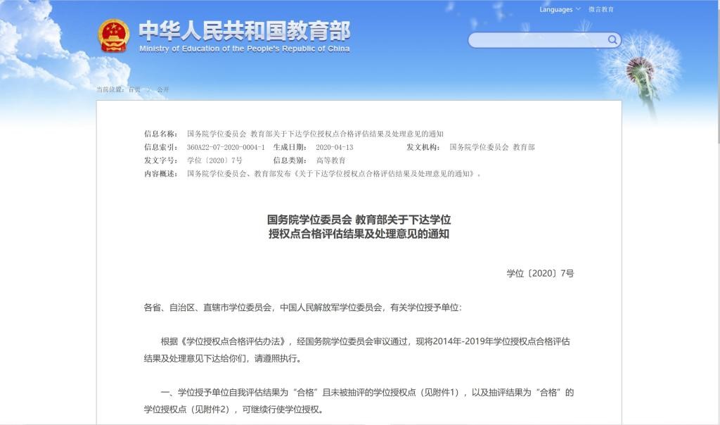 近日,国务院学位委员会、教育部下达2014年—2019年学位授权点合格评估结果及处理意见,我校参评的3个一级学科博士学位点、3个一级学科硕士学位点、2个二级学科硕士学位授权点全部合格。