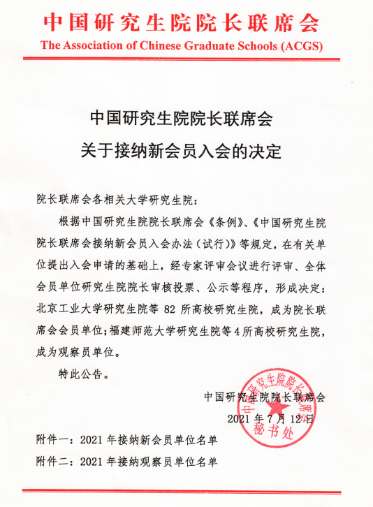 近日,我校收到中国研究生院院长联席会关于《中国研究生院院长联席会关于接纳新会员入会的决定》,经专家评审会议进行评审、全体会员单位研究生院院长审核投票、公示等程序,我校等82所高校研究生院正式获批成为院长联席会会员单位,福建师范大学研究生院等4所高校研究生院成为观察员单位。