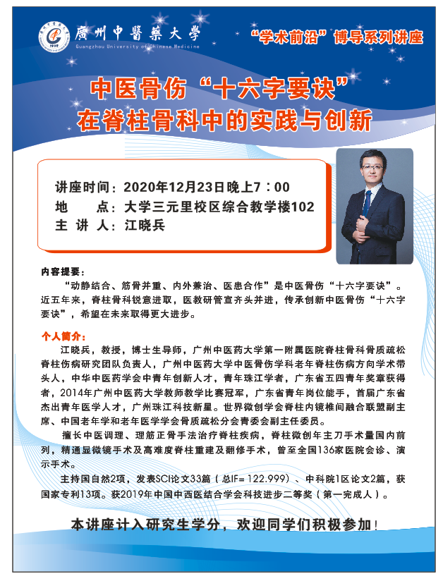 上一条:博导讲座:股骨头坏死研究35年得与失(主讲人:何伟) 下一条:博导讲座:关于“刺之要,气至而有效”的认知(主讲人:...