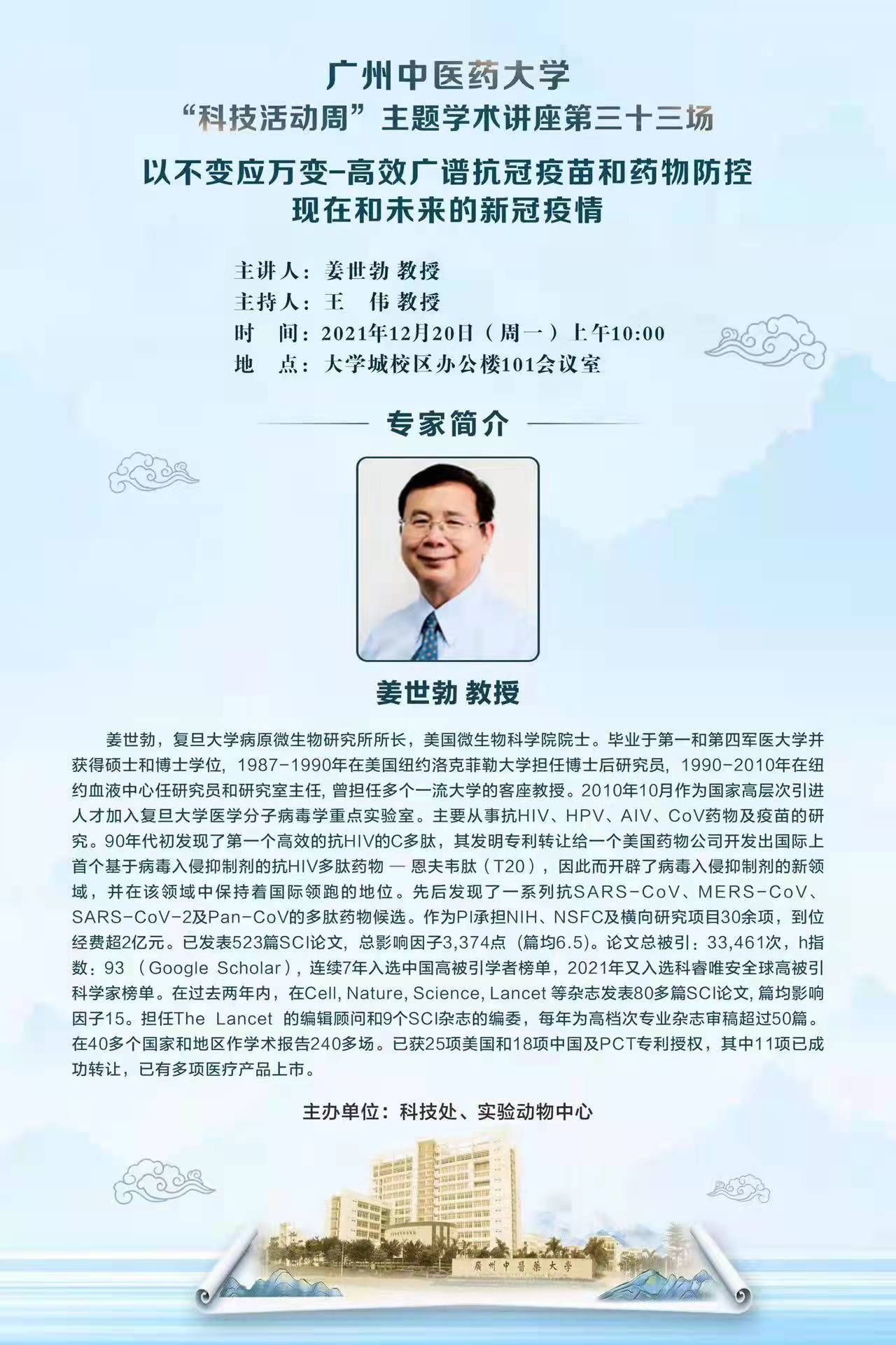 上一条:学术报告:整合医学纵论(主讲人:樊代明) 下一条:学术讲座;基于疾病进程的生理药代动力学模型应用与实践(...