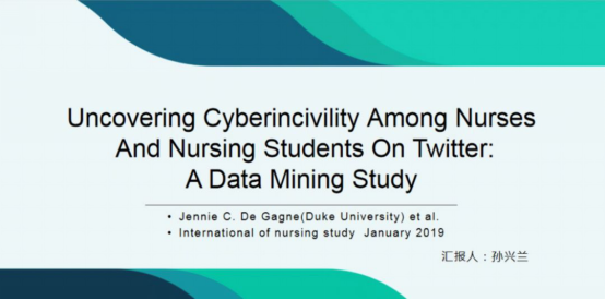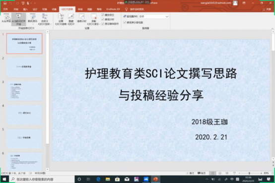 王珈同学分享的主题为《护理教育类SCI论文撰写思路与投稿经验》。王珈同学于2019年11月7日以第一作者发表1篇SCI论文在 《Nurse education today》期刊,JCR分区为护理学二区,IF为2.064,为我院在读硕士研究生首次发表护理教育类SCI论文。王珈同学结合自身经历,把论文撰写的思路详细地与同学们分享讨论,并指导在投稿前需准备的材料,分享过程思路清晰,内容丰富。