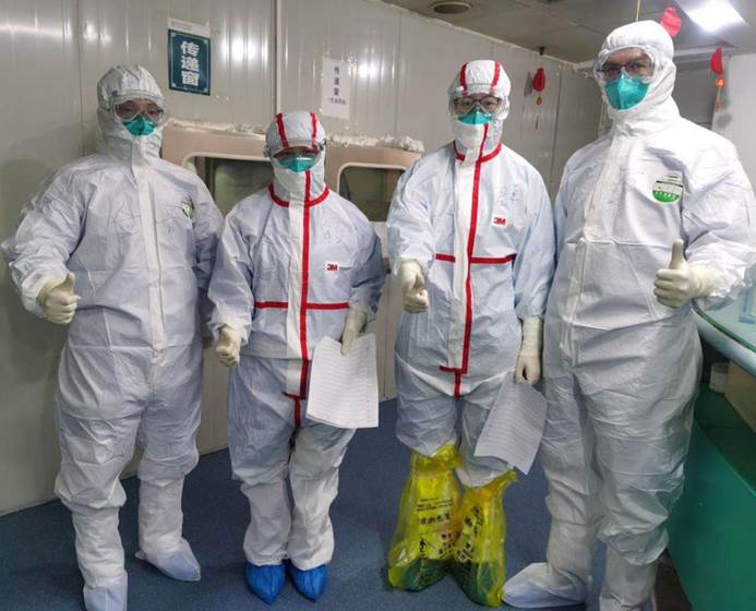 张俭博士(左1)、谢东平博士(右1)在武汉一线