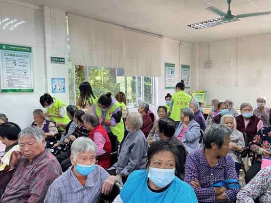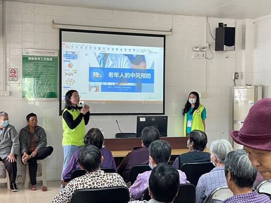 首先,研究生党支部卢英姿、陈善霞两位同志为老年人带来了一场生动有趣的健康小讲座,讲座主题为社区老年人高血压防治意识和脑卒中预防识别。她们结合实际生活中的事例,为老年人讲解了脑卒中常见症状的识别以及处理方式,接着讲述高血压的日常生活防治措施,并且运用所学的中医知识,为老年人介绍了穴位按摩、艾灸和耳穴压豆等中医护理技术的优势和应用要点。讲座现场气氛活跃,互动性十足。